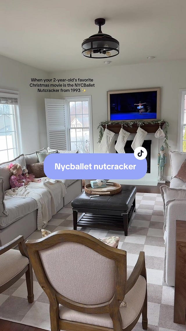 We have been starting our day with watching the 1993 New York City Ballet movie version (classical music pairs so much better with my coffee than any of Flora’s fave kid shows) and she can’t take her eyes off of it — video proof below.